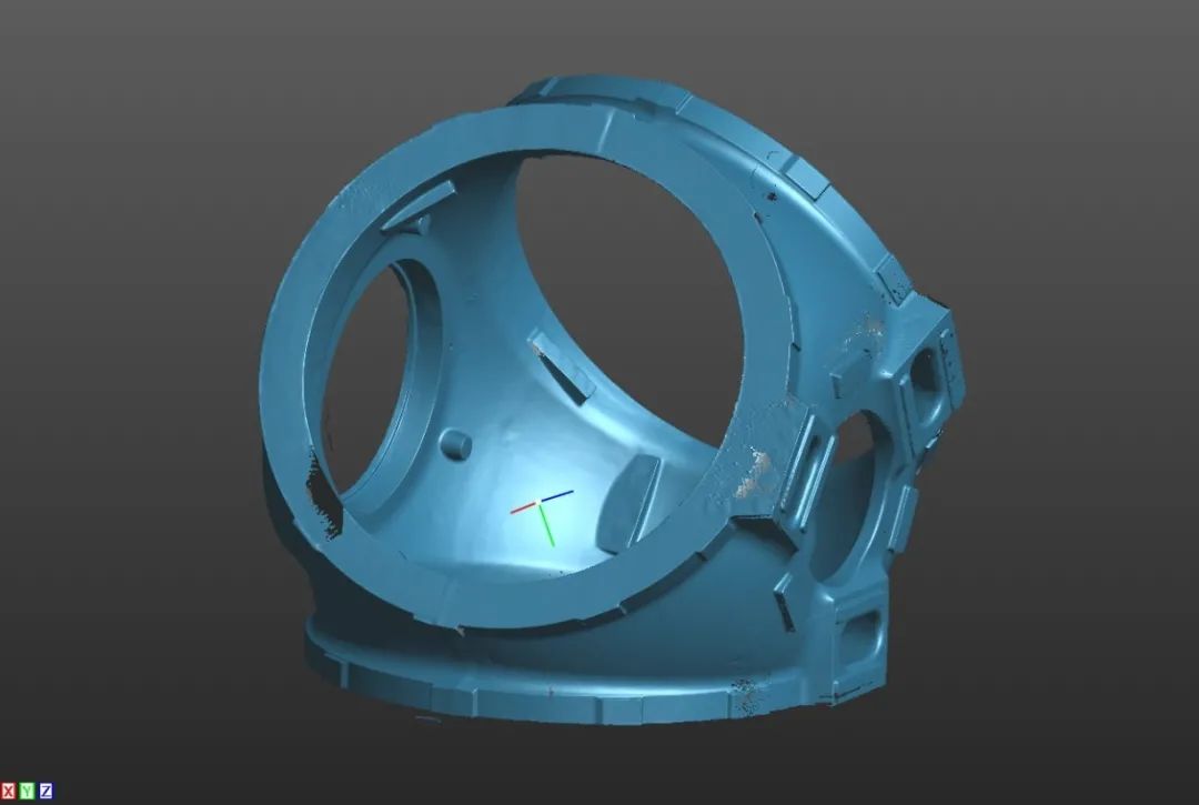 客户是一家生产风力发电设备相关部件的企业,此次扫描检测的是一个大型风机头铸件(直径约3m),要求数据采集完整(包括底部),精度±3mm,主要用于尺寸测量、输出检测报告、保存数据以及更好地对接客户。