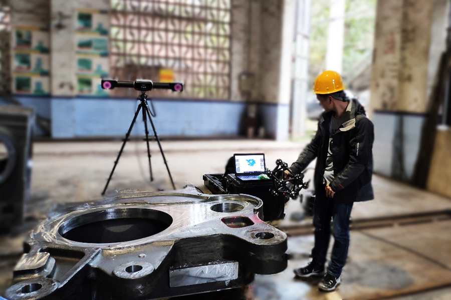 以大型铸造件的检测为例,铸造检测包括了型砂性能检测、外观质量检测、内在质量检测。其中外观质量的检测,主要借助于传统检测设备,如划线机、三坐标等。划线检测是比较常用的铸件尺寸检测方法。划线检测的依据是铸件图,根据铸件图中的公差要求,借助于平台、支撑及必要的工、夹、量具等来确定铸件的测量基准,划线检测铸件的尺寸;而类似于三坐标这种高精度的检测仪器对于中小型产品的检测,它提供了精湛的质量技术保障,但三坐标不适用于这种大型,重型的工件,原因是大行程三坐标/龙门机,成本高、效率低。对于大型铸件的质量检测,现在国际上流行的是三维扫描测量。通过三维扫描获取产品的点云数据,建立高精度的三维模型,然后利用该模型与理论模型进行直接对比,可以快速准确计算和量化产品与其设计尺寸的偏差,进而判断产品是否合格(也可在加工过程中对工件进行扫描,判断加工误差,从而根据检测结果及时调整加工参数,提高良品率)。利用三维点云模型完成对产品的全面检测,这种非接触式的检测方法解决了很多传统测量工具无法完成的测量要求,逐步向实时处理和自动化方向发展,极大的提高了检测工序的质量和效率。
