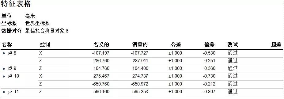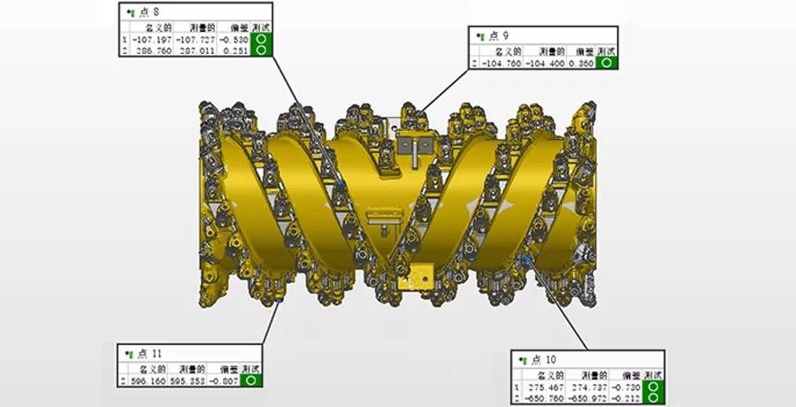 利用铣刨鼓两端面、筒身特征约束XYZ平移自由度;点8、9、10、11四点约束YZ方向旋转自由度。最后将扫描数据与CAD数模实现完全约束。(点8、9、10、11的单点偏差分别如下图所示)