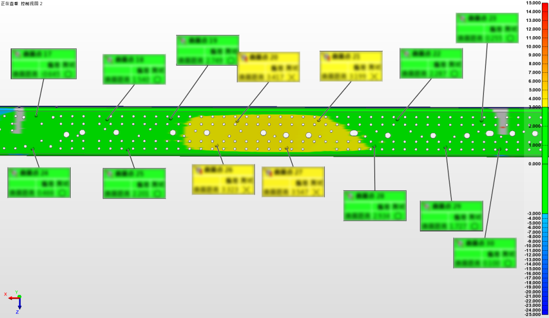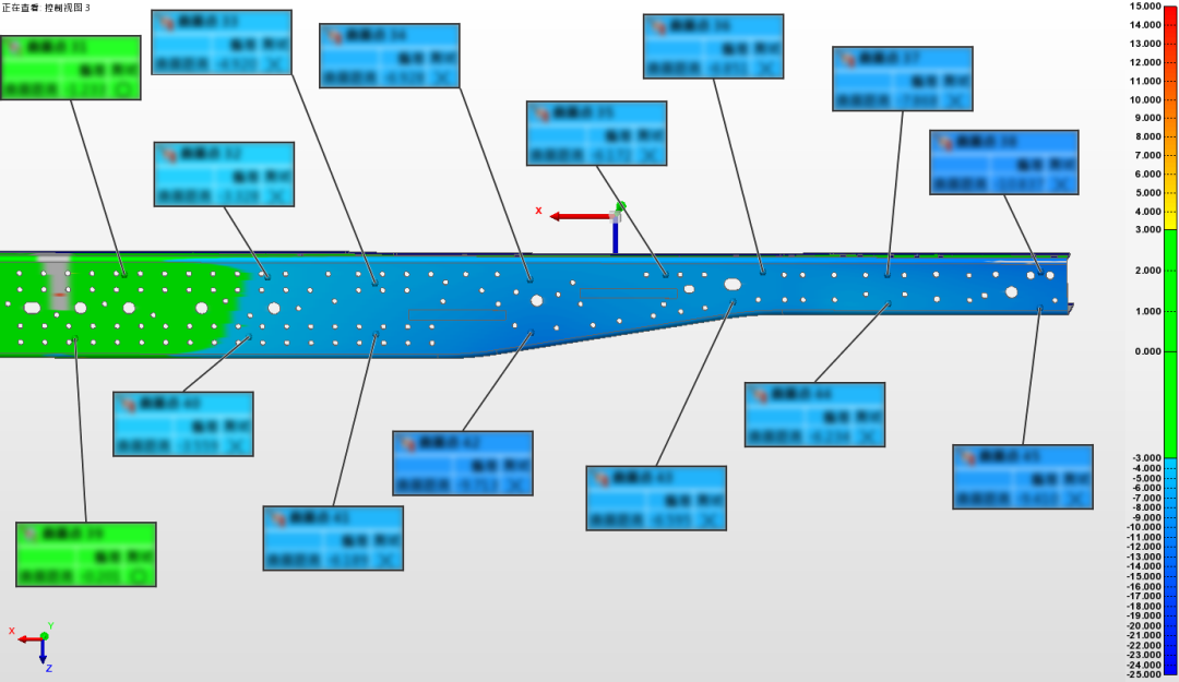这一方案可实现孔位快速高精度检测,有效检测车架孔位是否满足设计要求,确保后续车架装配质量及其他部件装配位置精度。同时,型面检测结果能够更加精准地反映出模具加工精度和材料变形量,这些数据对前期加工分析都能提供很大帮助。